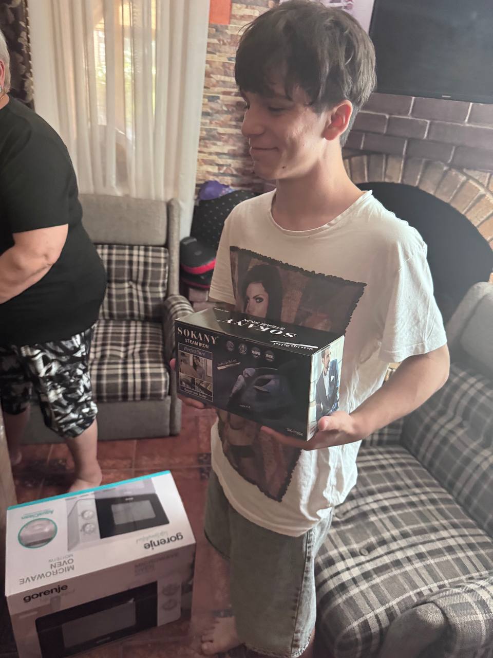 The freezer makes it possible to store enough food for a household of twelve. The oven and microwave simplify daily cooking for a large family. The mobile phones help the children stay connected and access school materials. The TV provides access to educational content and shared family time. Even small essentials like an iron help maintain normal routines.